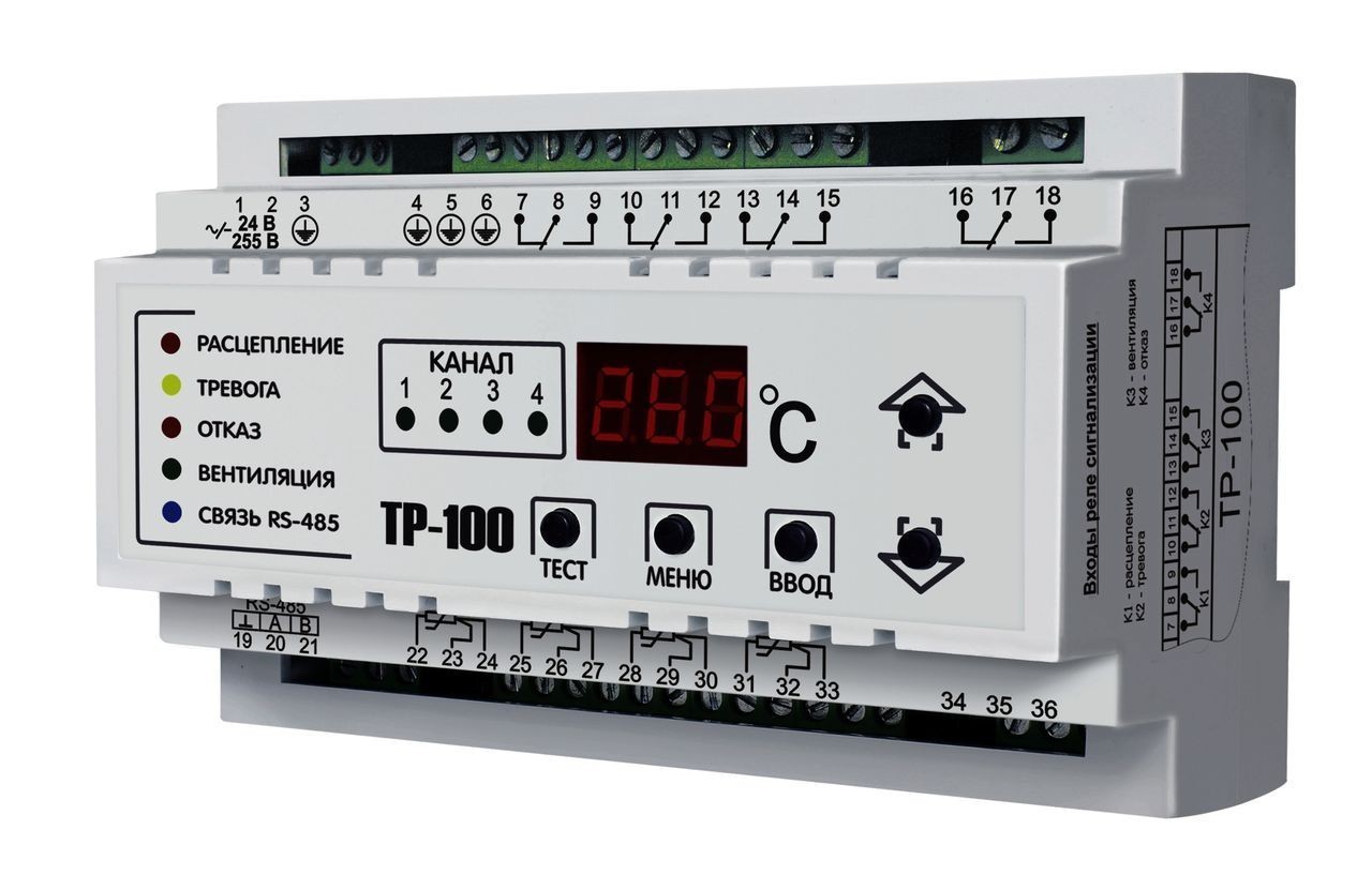 ТР-100 предназначен для измерения и контроля температуры устройства по четырем датчикам PT100, подключаемым по двух - или трехпроводной схеме, с последующим отображением температуры на дисплее и выдачей сигналов тревоги при выходе каких либо параметров за установленные пределы. Может применяться для защиты: